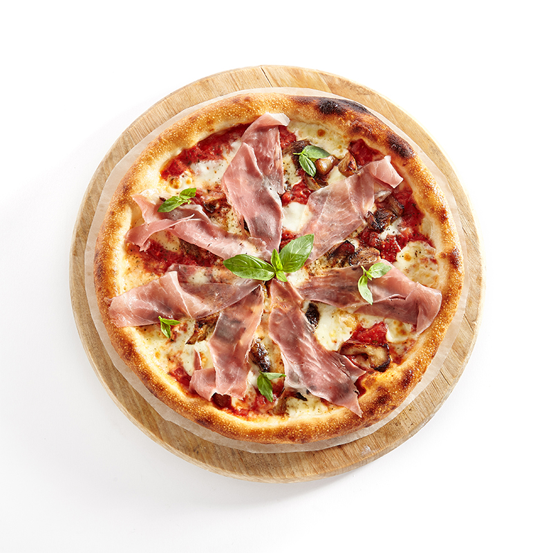 Fond tomate, mozzarella, munster, pesto, jambon serrano, grana padano